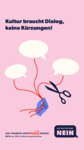 Für die Schweizer Kultur ist die SRG eine wichtige Partnerin: als Produzentin, als Vermittlerin und als Stimme der Kulturberichterstattung – gerade weil sich private Medien aus diesem Bereich teilweise zurückziehen. Über Auslandsmandate wie 3sat, TV5MONDE, tvsvizzera.it und SWI swissinfo.ch wird Schweizer Kultur zudem auch international sichtbar. Weniger Produktionen und weniger Ausstrahlung würden sich direkt auswirken: auf Aufträge, Präsenz und Erlöse aus Rechten und Verwertungen – über Sparten und Regionen hinweg.